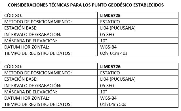 A partir del punto base se en lazaron los puntos geodésicos denominadas LIM05725 y LIM0572 son hitos de concreto con incrustaciones en la parte central de un disco de bronce de 7cm de diámetro, efectuándose el rastreo con equipo receptor GNSS de doble frecuencia, distribuidos en lugares que permitan su visibilidad, permanecía y amplio campo visual en las áreas de intereses.