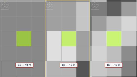 En el caso de aplicar resampling a imágenes tomadas con UAV (UAV-I), se persigue obtener una nueva imagen que simule una altura de vuelo mayor (con menor resolución espacial) a partir de una imagen e baja altitud (alta resolución espacial) para reducir costes económicos (menor número de vuelos), tiempos y optimizar el análisis (mapas se obtienen en menor tiempo).