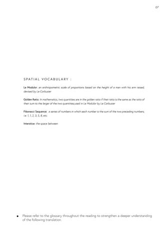 SPATIAL VOCABULARY : Le Modulor: an anthropometric scale of proportions based on the height of a man with his arm raised; devised by Le Corbusier Golden Ratio: In mathematics, two quantities are in the golden ratio if their ratio is the same as the ratio of their sum to the larger of the two quantities;used in Le Modulor by Le Corbusier Fibonacci Sequence: a series of numbers in which each number is the sum of the two preceding numbers; i.e. 1, 1, 2, 3, 5, 8, etc. Interstice: the space between