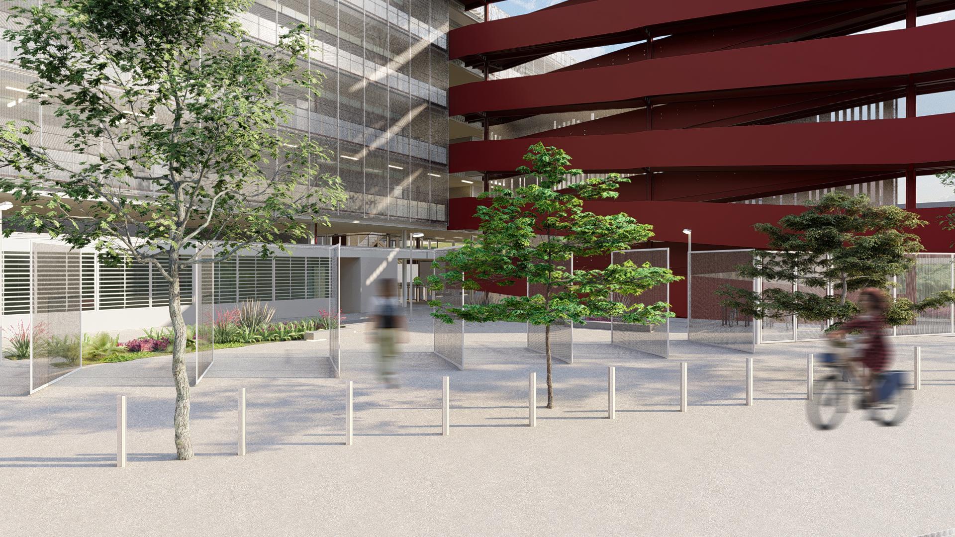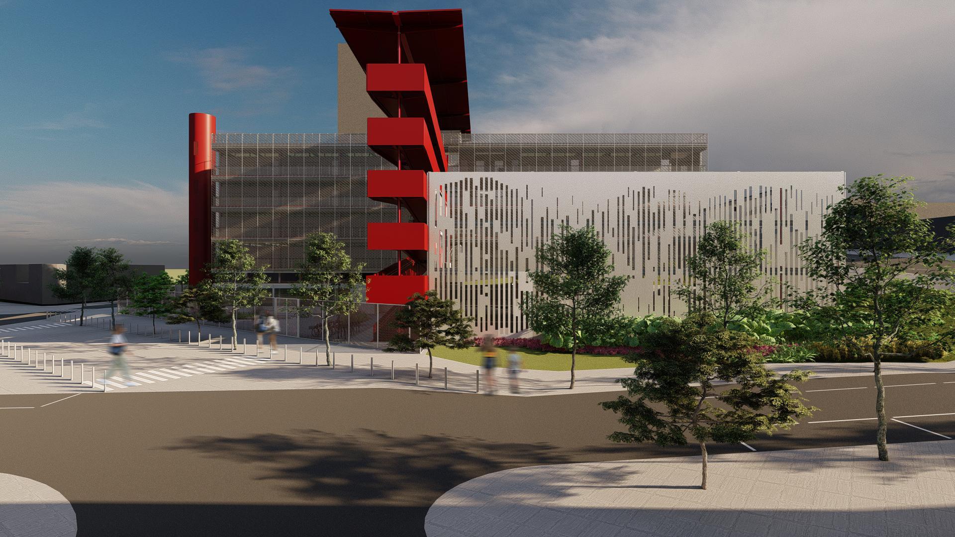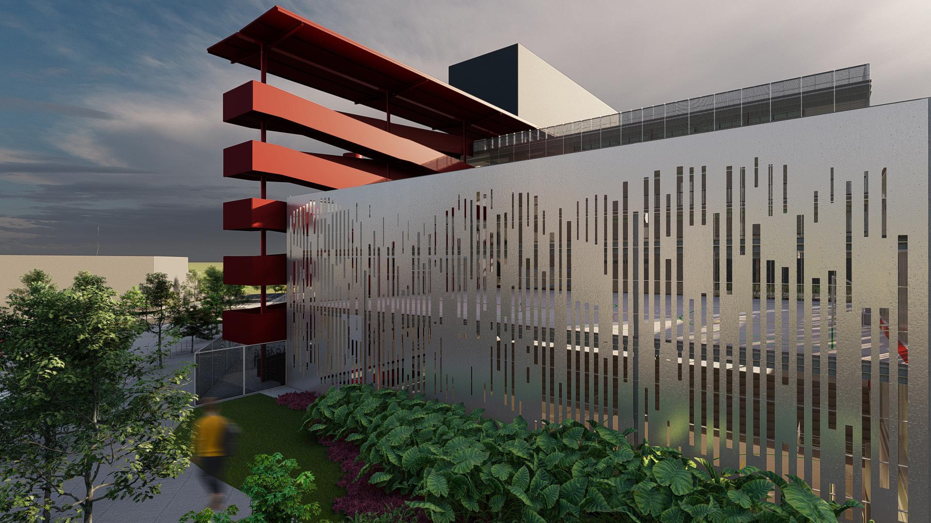 aescolapropostapossui todos os elementos de circulação em vermelho - rampa, escada, corredor-portanto,para equilibrar, o bloco principal e a quadra foram envoltos com painéis perfurados metálicos que funcionam como uma máscara que “desaparece” na paisagem