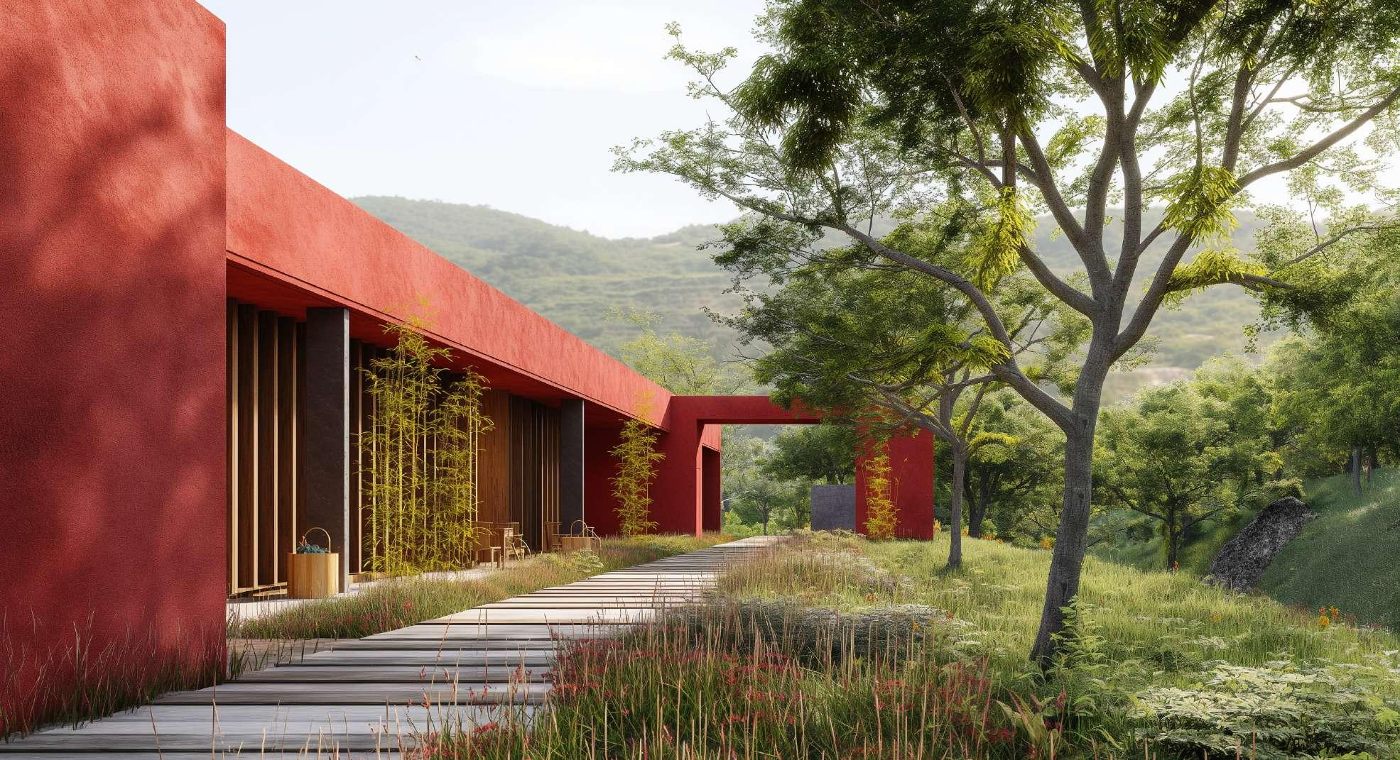The structure, enveloped in hues of earthy red, stands as a serene sanctuary, embracing guests in a cocoon of healing energy. Its square shape embodies the stability and grounding that supports the journey to wellness, while the central courtyard, crowned by a celestial skylight, invites the healing rays of the sun to bathe the space in rejuvenating light invites the boundless energy of the cosmos.