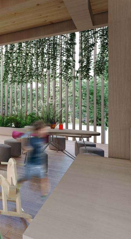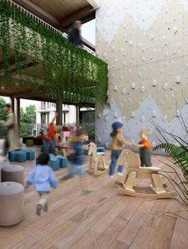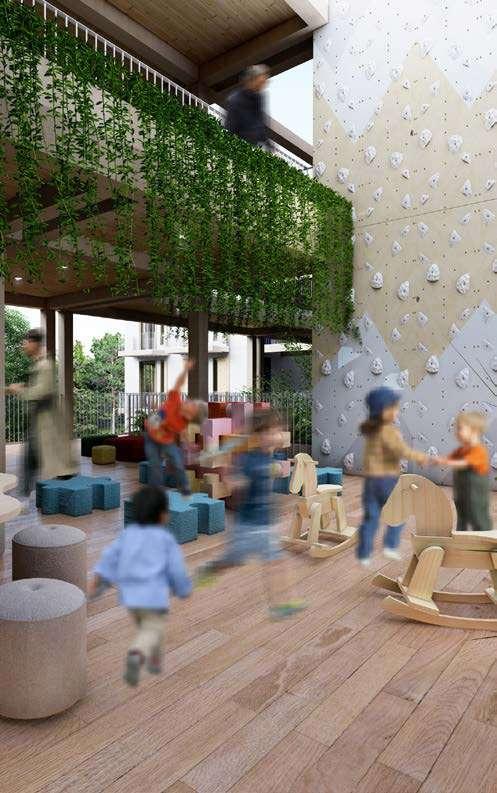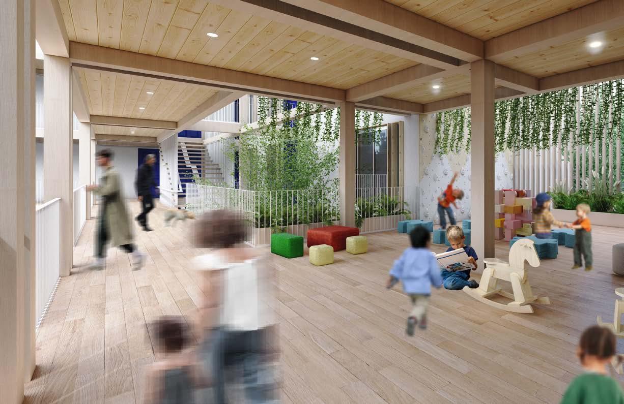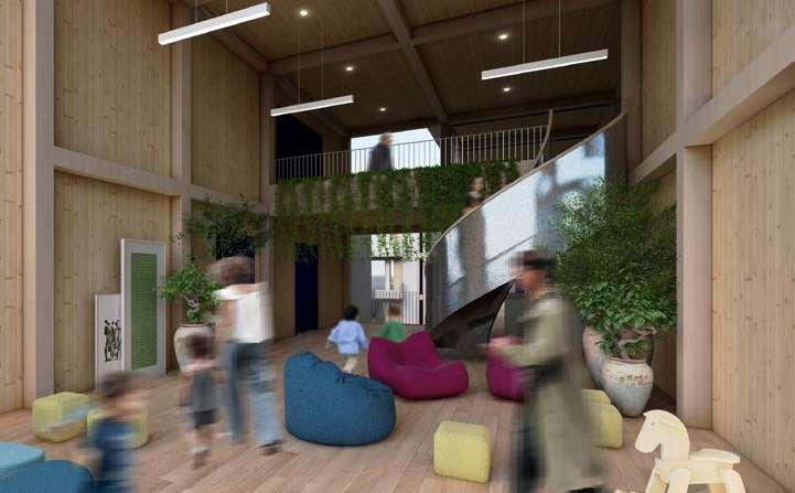 The second-floor corridor corner in the social housing project was transformed into a children's play area and a communal space to encourage social interaction among different age groups. Both areas feature double-height ceilings, enhancing the sense of space and allowing views and interactions between floors.