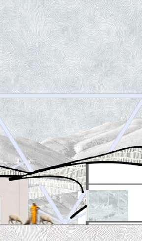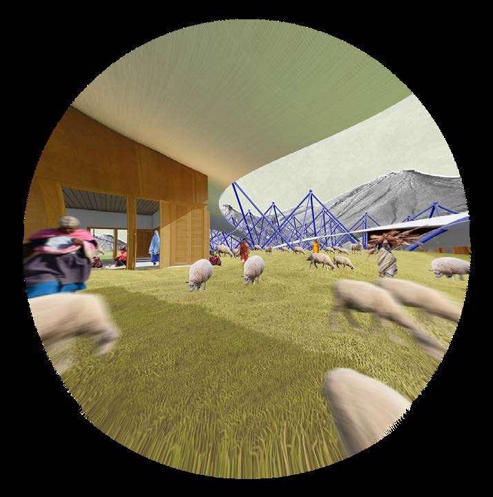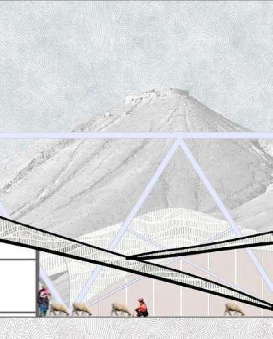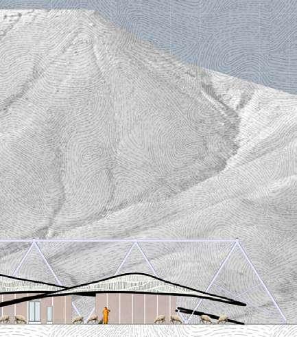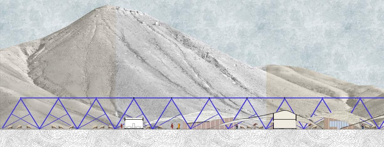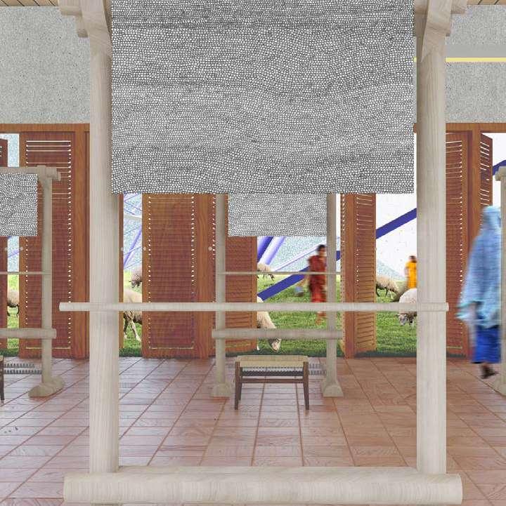 The tensioned fabric structure above each workshop,indicates the underlying tension and shared struggle felt among the women and the sheep of Lo, striving to set free from the norms and embrace a new path forward. This taut tension serves as a transitional zone, where both the neglected entities of Lo come together