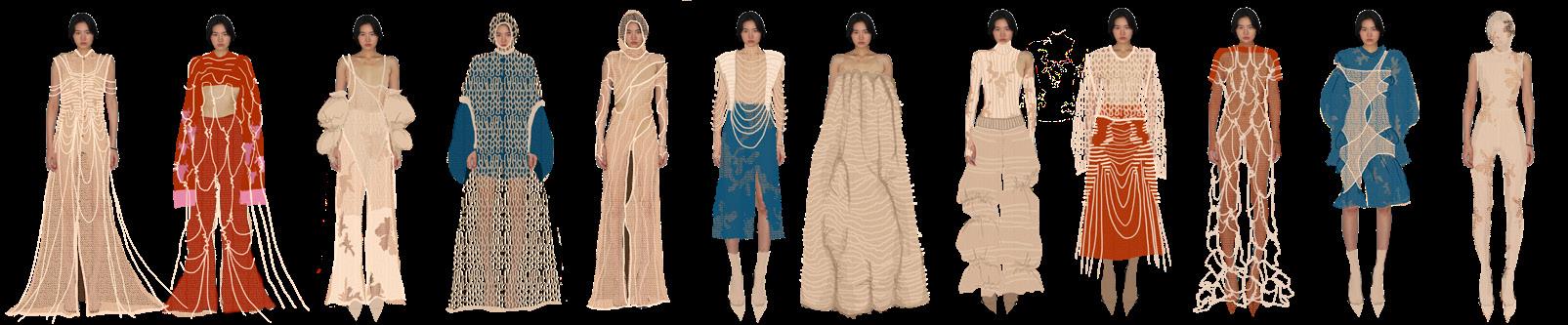 MEMORIES ARE UNRELIABLE, WE IDOLIS, HIDE IN THE DARKEST CORNER OF OUR MIND, OR ALTER THEM ACCORDING TO OUR BIASES. IN THIS COLLECTION THE FLEATING EXISTENCE OF MEMORIES ARE SHOWN THROUGH DELECATE DÉVORÉ PAINTED FABRICS, FLUID, INSEPARABLE SILHOUETTES AND THREADS FLOWING AND TANGLING UP WITH EACH OTHER.