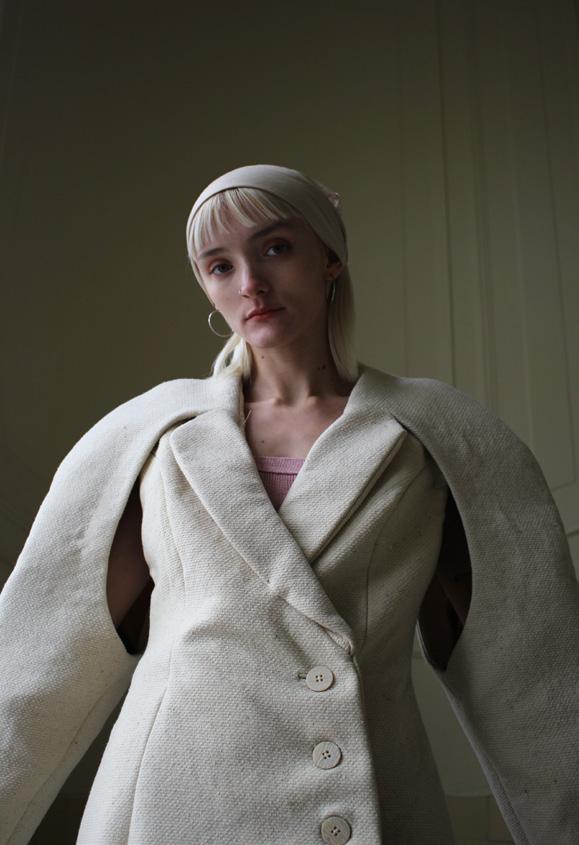 WHAT MAKES A COAT A COAT ? INSPIRED BY THE OVERSIZED AND EMPHASIZED COLLARS OF OUTERWEAR FROM THE PAST, I WANTED TO SEE THE LIMITS OF HOW EXRAVAGANT COLLARS CAN BE WITHOUT LOOSING THEIR SIGNATURE APPEARANCE. THE END RESULT IS A SCULPTURAL, YET FUNCTONAL PIECE, A FLATTERING FITTED SILHOUETTE FOLLOWING THE PRINCIPLES OF TRADITIONAL TAILORING WITH AN EXAGGERATED COLLAR TURNING INTO WHAT ONCE WERE THE SLEEVES. THIS IS WHERE MY DSEIGNS TOOK A TURN TO A MORE EXPERIMENTAL DERICTION.
