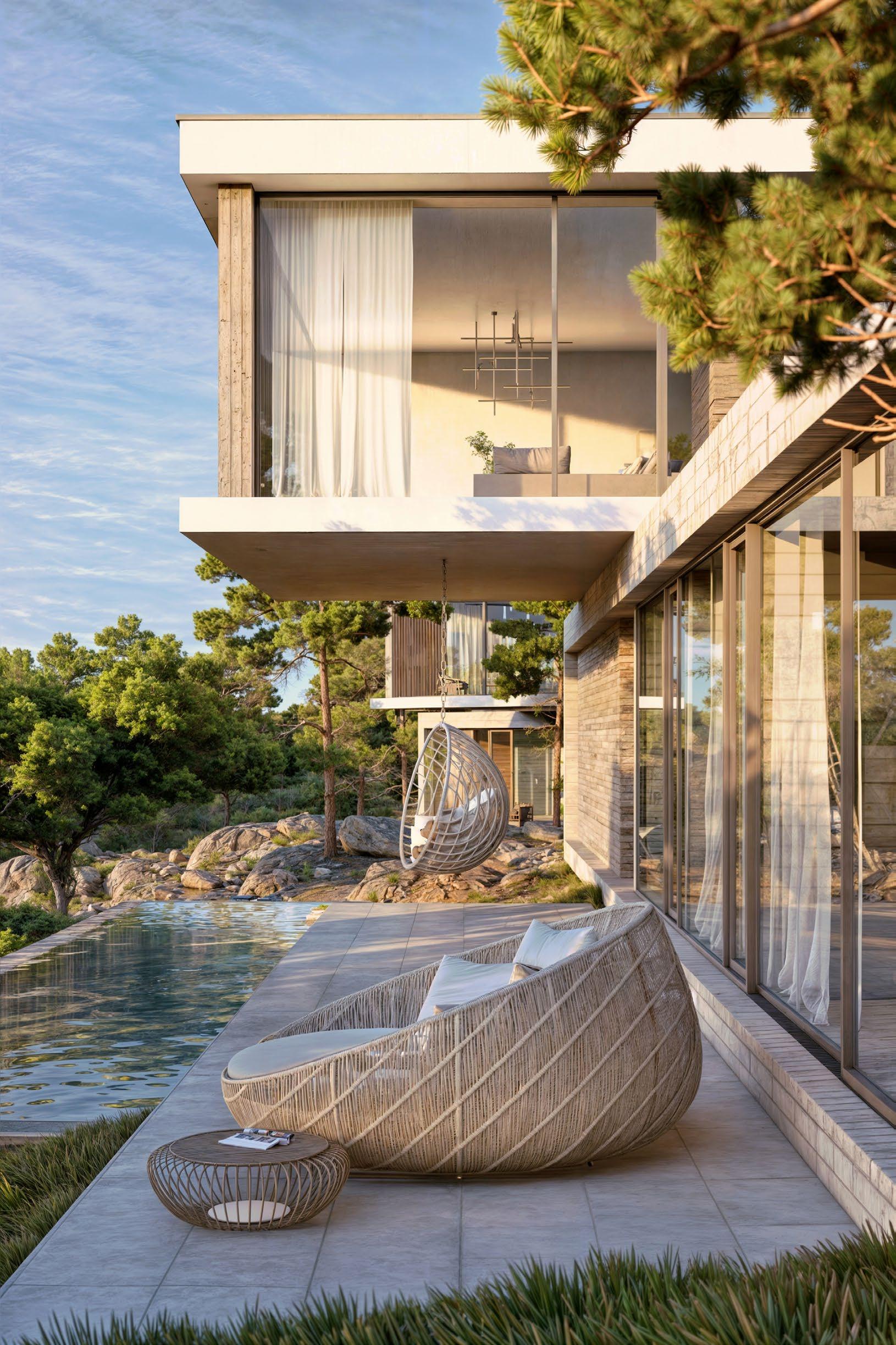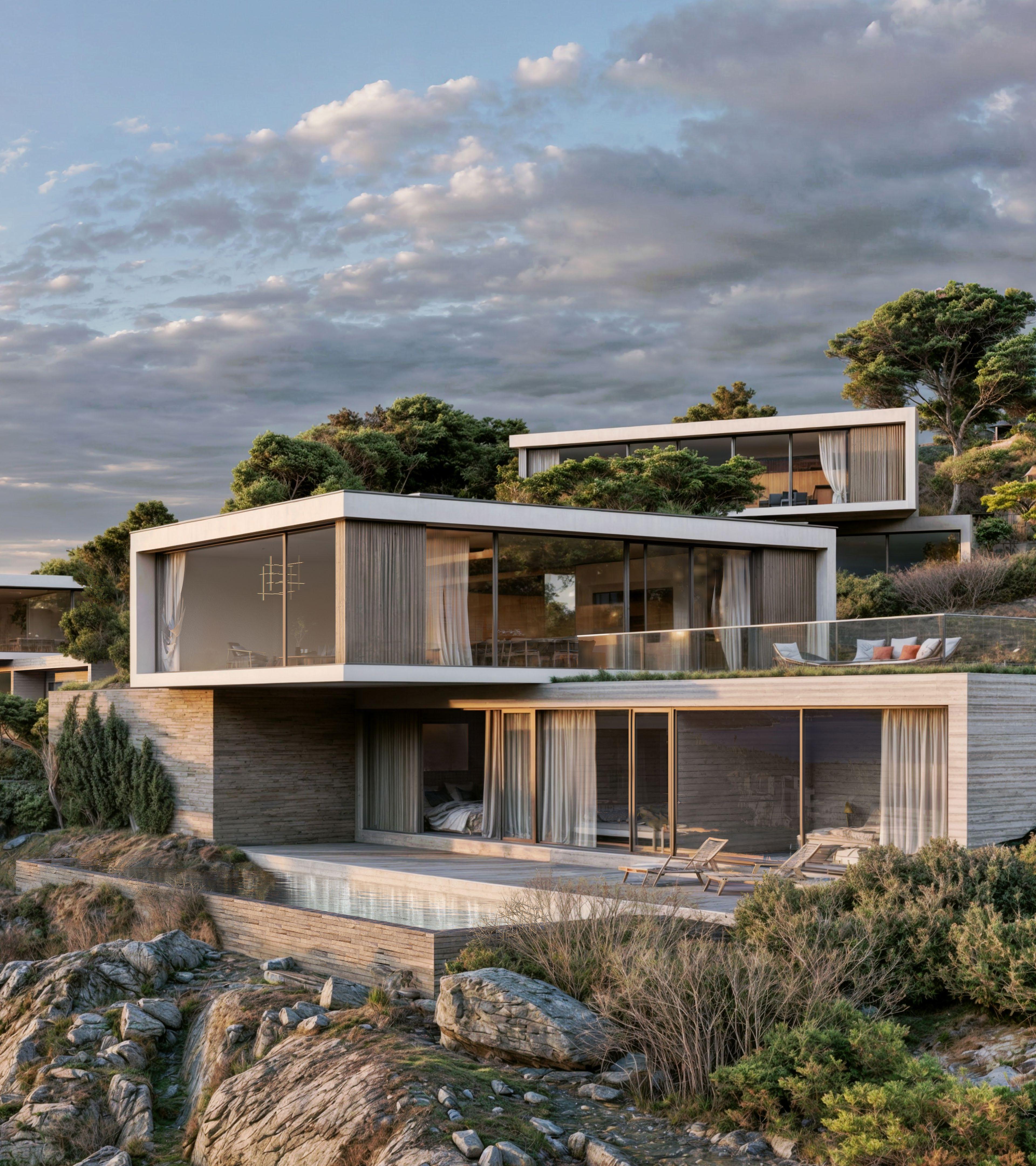 Der Bauträger plante einen Wohnkomplex mit mehreren Villen an einem felsigen Hang und wandte sich an uns, damit wir ihm bei der Umsetzung seiner Vision helfen. Die minimalistischen Gebäudekonzepte mit großen Glasflächen und Terrassen wurden entlang einer öffentlichen Straße angeordnet, um die Aussicht zu maximieren und gleichzeitig Intimität zu sichern