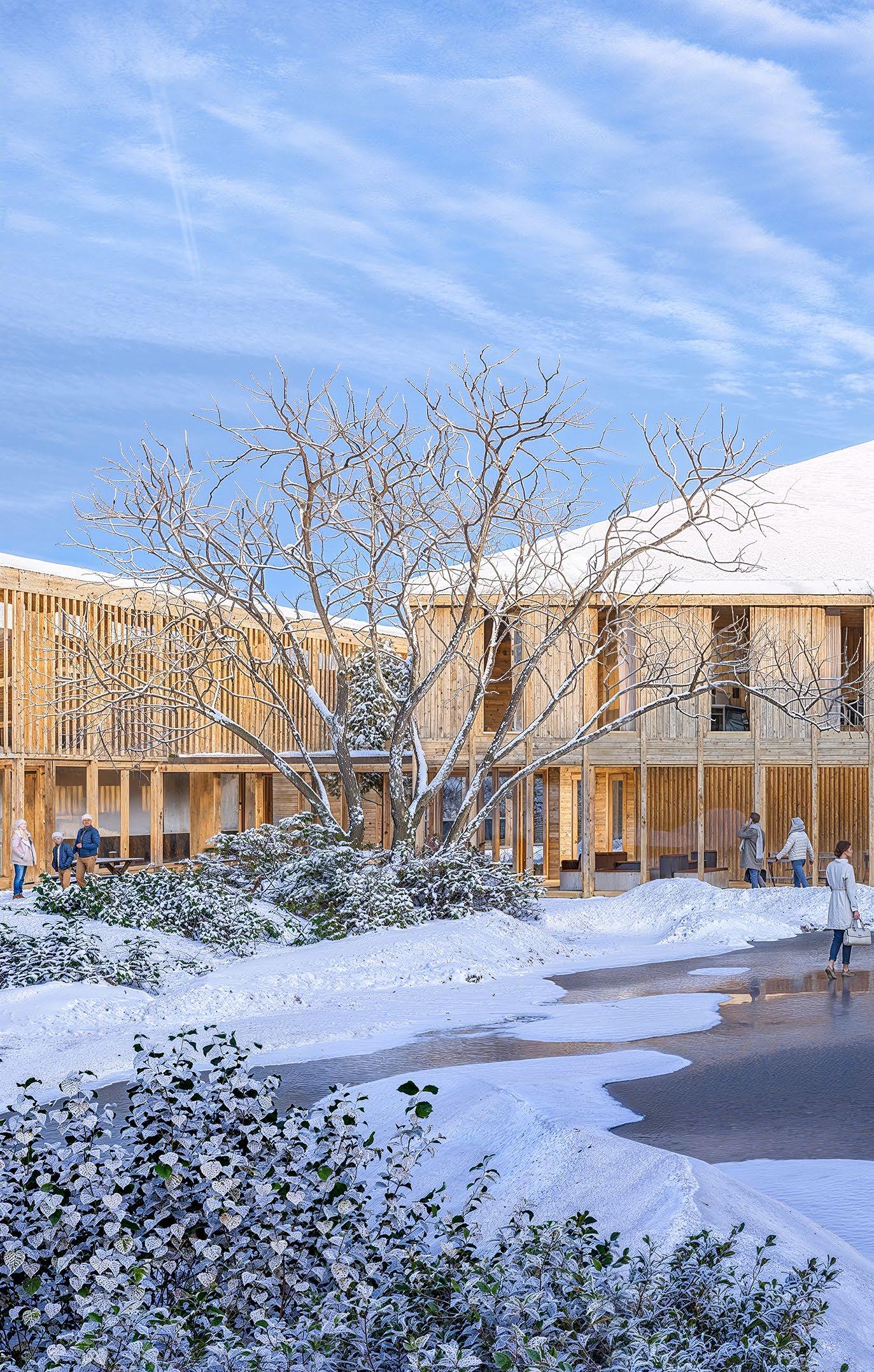 After the site plan was completed, I was tasked with creating a coherent look for this newly built school complex. The same grid on all the buildings, using the same elements and materials, creates a link between the buildings, while giving each one a different design.