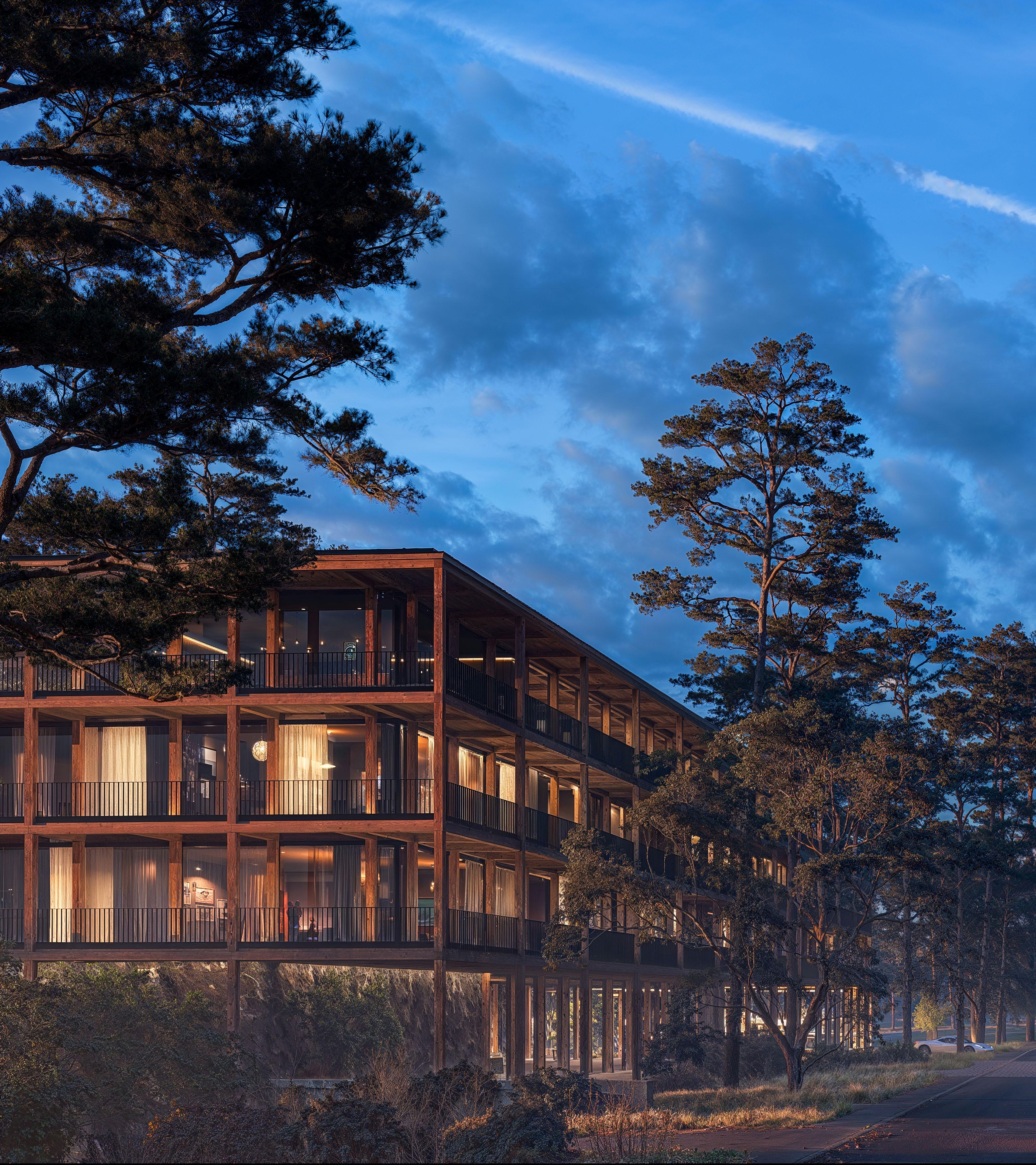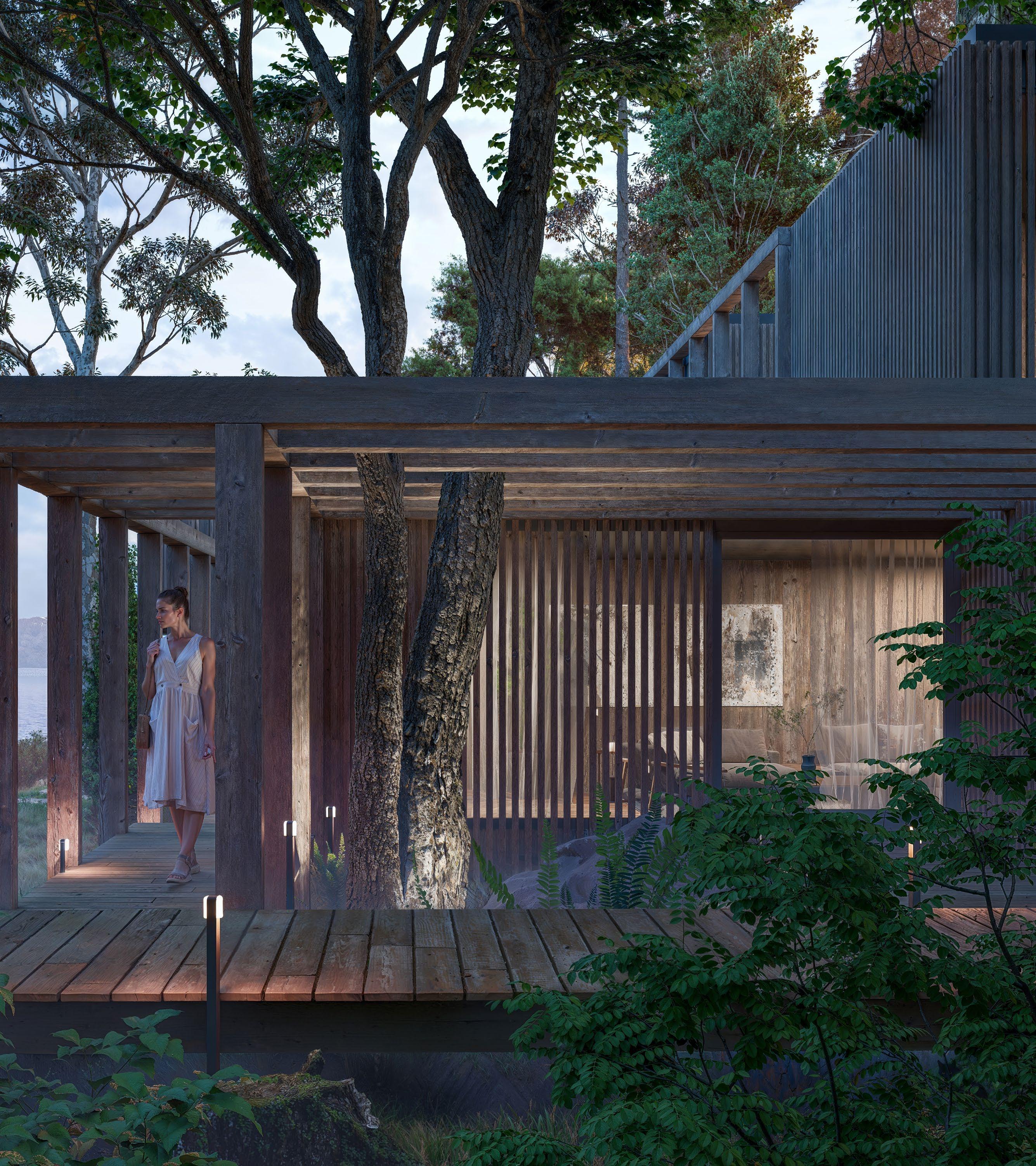 This direct lakeside hotel project consists of several elements: a hotel building, a small staff accommodation and separate apartment buildings. In designing the concept of the apartment buildings, my main focus was on the connection with nature and the forest, in addition to the lake view - achieved through large glass surfaces, intimate inner courtyards and the use of as much wood as possible.