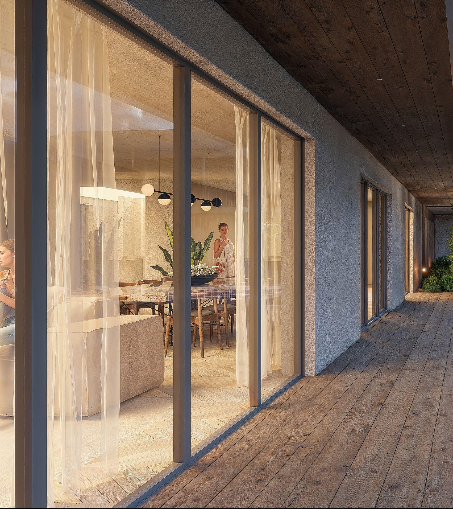 The developer envisioned a multi-villa apartment complex on a rocky hillside and approached us to help him realise his vision. The minimalist building concepts, with large glass areas and terraces, were arranged along a public road, spaced to maximise views while ensuring intimacy.