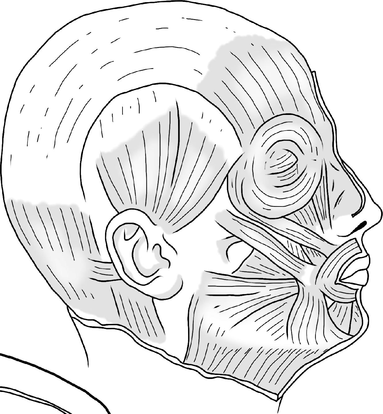 Mięśnie twarzy (wyrazowe) (mm faciales, facial muscles) są unerwiane przez nerw twarzowy. Mięsień naczaszny (m. epicranius, epicranius muscle) składa się z mięśnia potyliczno-czołowego i mięśnia skroniowo-ciemieniowego połączonych czepcem ścięgnistym (galea aponeurotica, epicranial aponeurosis).