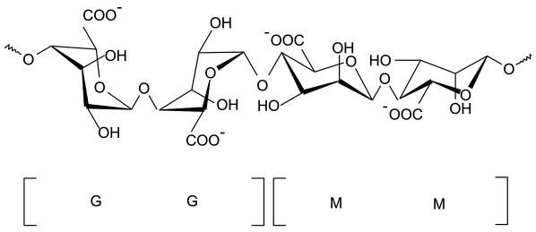 wysokiej masie cząsteczkowej (104–106 g/ml). Składnik ten (Gacesa 1998) jest zbudowany z dwóch reszt kwasu uronowego: β-D-mannuronian, zwanego również M, oraz jego C-5 epimeru, α-L-guluronianu, zwanego również G (por. rys. 3.1).