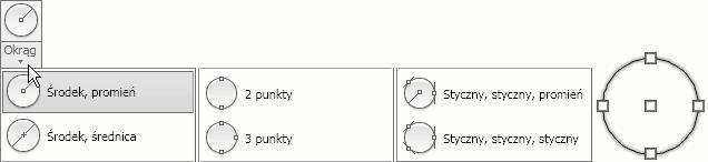 Na panelu Rysuj (Draw) są dostępne bezpośrednio wszystkie opcje, a także dodatkowa opcja (funkcja) niewystępująca standardowo w poleceniu OKRĄG (CIRCLE).
