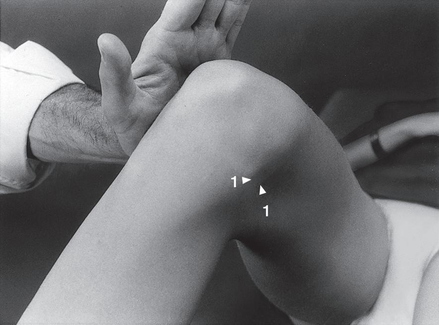 Sposób badania: Podczas tego manewru przesunięcie rzepki od strony przyśrodkowej w stronę boczną sprawia, że troczek (pokazany na ryc. 10.40) ustawia się w płaszczyźnie zbliżonej do strzałkowej. Troczek boczny rzepki stanowi wzmocnienie torebki stawowej i pod palcami jest wyczuwalny jako włókniste pasmo.