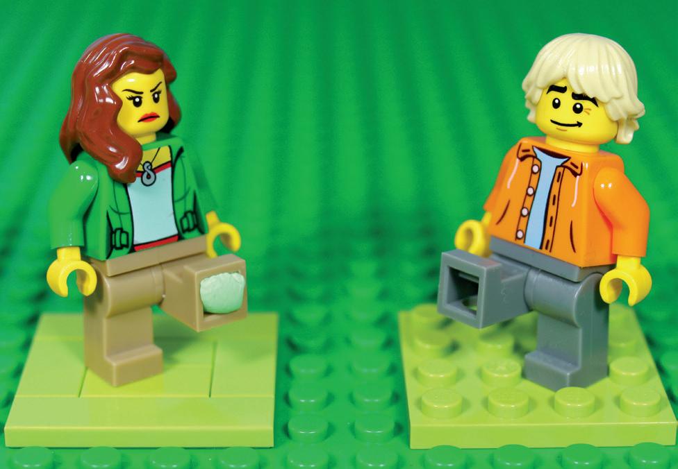 Jeśli chcemy, aby nasza postać chodziła po płaskiej powierzchni, do jej przymocowania możemy użyć kitu (lub plasteliny). Musimy jednak pamiętać, że może on zostać na powierzchni i trzeba go będzie sprzątnąć między kolejnymi ujęciami. Powierzchnia może składać się w większości z kafelków, ale wtedy pod nogą postaci trzeba ukryć płytkę 1 × 1. Ten sposób był wykorzystany do przymocowania Anny i Matta do ich koca piknikowego w Magicznym pikniku . Animowanie chodzenia na płytkach LEGO jest trudne (nawet dla nas, weteranów), więc polecamy, aby pierwszą animację chodzenia zrobić na płaszczyźnie z wypustkami.