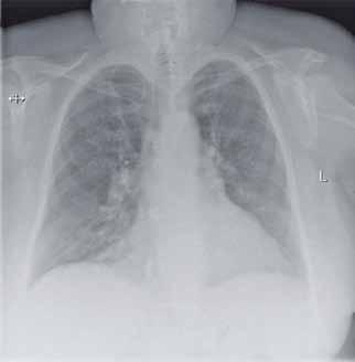 1. RTG klatki piersiowej (r yc. 2.1) – wykazało w prawym środkowym polu płucnym w rzucie przedniego odcinka III żebra, w linii przy mostkowej widoczny nieregularny dobrze wysycony cień o średnicy 8 mm – zmiany włókniste pozapalne (wykluczono proces rozrostowy w dalszej diagnostyce). Poza tym pola płucne bez zmian ognisko wych. Sylwetka serca w granicach normy. Przepona i kąt przepo ‑ nowo żebrowy wolne.