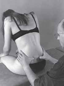 3. Testy ruchomości (opisane powyżej; nacisk na kość biodrową w kierunku do dołu i na zewnątrz, z jednoczesnym unieruchomieniem kości biodrowej strony przeciwnej); na zakończenie badania klinicznego wykonujemy test Downinga (patrz „Testy”), który pozwoli na potwierdzenie rodzaju ograniczenia ruchomości, tzn. określenie, czy kość biodrowa jest ustawiona z przodu, czy z tyłu.