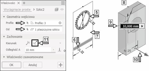 Nie zaczynać od wybierania obszaru 7. Jeżeli wybierzemy go jako pierwszy, to podgląd tworzonej bryły ( 8) zasłoni profil i jest bardzo prawdopodobne, że zapomnimy wybrać obiekty 5 i 6.