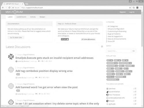 Pełna lista dostępnych funkcji znajduje się na stronie głównej witryny GitHub tego projektu29 . Tak czy inaczej, najprostszym sposobem zapoznania się z tą aplikacją jest przejście na stronę https://support.mvcforum.com/, która jest zarządzana za pomocą samej tej aplikacji (witryna ta nie jest pod naszą kontrolą, tak więc używana w niej wersja aplikacji może być nowsza, a sama strona może być nawet niedostępna). Zakładając, że witryna ta nie została zmieniona w zbyt dużym stopniu, powinna ona wyglądać podobnie do tej przedstawionej na rysunku 9.1.