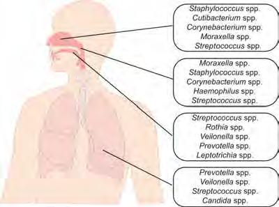 Górny odcinek układu oddechowego również jest bogato zasiedlony przez drobnoustroje. W składzie mikrobioty jamy nosowo-gardłowej znajdują się bakterie występujące na skórze, między innymi gronkowce, bakterie z rodzaju Cutibacterium oraz Corynebacterium
