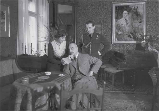 Wojciech Kossak z córką, Magdaleną Samozwaniec, i z mężem Lilki, Stefanem Jerzym Jasnorzewskim, w salonie Kossakówki. Kraków, 1936 rok