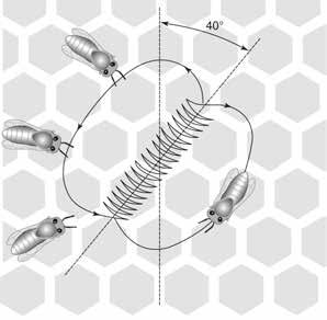 RYC. 17. Pszczoła zbieraczka wskazuje robotnicom kierunek, w jakim znajdują się zasoby pokarmu (a) za pomocą kąta tańca względem linii pionowej, który to kąt odpowiada kątowi między kierunkiem pożywienia a azymutem słońca [punktem na horyzoncie znajdującym się bezpośrednio pod słońcem (a, b)].