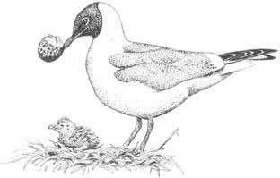 RYC. 3. (a) Samiec i samica mewy śmieszki usuwają pustą skorupę jaja po wykluciu się piskląt; (b) Tinbergen testował hipotezę głoszącą, że białe, ząbkowane krawędzie skorupek stanowią wskazówkę wzrokową dla drapieżnika. W badaniach terenowych wykazano, że im bliżej gniazda znajdowała się pusta skorupka jaja, tym więcej jaj znajdował drapieżnik