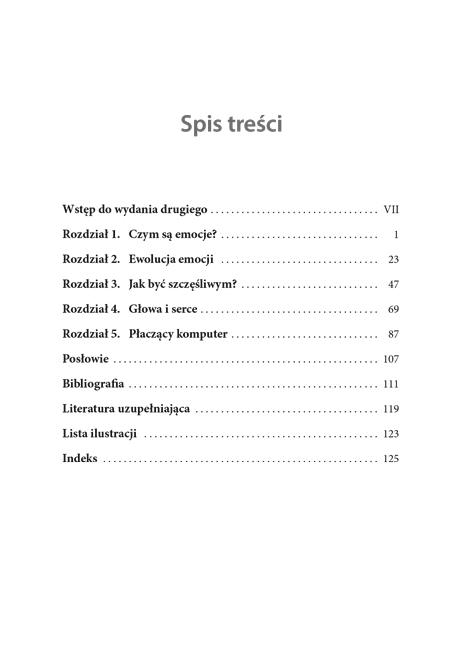Tak krótka książka nie jest oczywiście w stanie zawrzeć wszystkich aspektów tak złożonego obszaru badań. Niektóre niezwykle interesujące zagadnienia w obszarze badań nad emocjami jestem zmuszony odłożyć na bok. Czytelnicy nie znajdą w tej publikacji rozważań na temat rozwoju emocji u dzieci, choć badania nad tym zjawiskiem również rozwijają się w szybkim tempie. Nie ma tu też wzmianki na temat coraz obszerniejszego piśmiennictwa dotyczącego indywidualnych różnic w doświadczaniu emocji. Dokonany przeze mnie wybór tematów odzwierciedla moje własne zainteresowania i przekonania na temat tego, co najbardziej zaciekawi czytelnika.