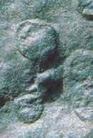 RYC. 12-9. Skamieniałości zachowane w skałach chińskich sprzed około 580 mln lat. Obraz po stronie lewej jest fotografią skamieniałości, a obraz po prawej – rysunkiem tego samego okazu. Te niewielkie organizmy wielokomórkowe cechuje symetria dwuboczna. Podobnie jak współczesne zwierzęta o takim planie budowy, organizmy te, jak się wydaje, posiadały wewnętrzne, środkowe i zewnętrzne warstwy komórek, przewód z otworem chłonącym, przez który przechodził pokarm przeznaczony do trawienia, oraz jamy po lewej i prawej stronie ciała. (Za zgodą: J.Y. Chen, Nanjing Intitute of Geology and Paleontology).