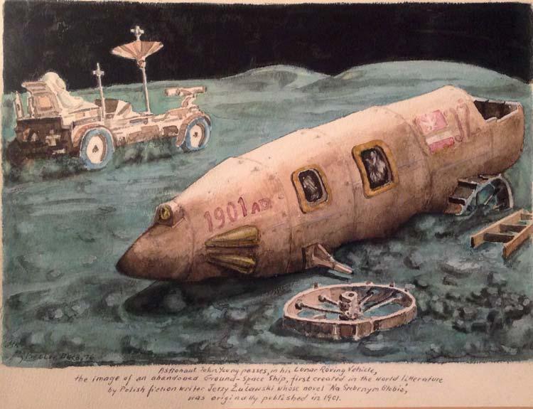 Akwarela namalowana przez M.G. Bekkera w 1978 roku. Astronauta John Young porusza się swoim LRV (Lunar Roving Vehicle) za wizerunkiem Ground-Space Ship, który po raz pierwszy w światowej literaturze pojawił się w książce polskiego pisarza science fiction Jerzego Żuławskiego Na srebrnym globie z 1903 r. Źródło: z archiwum Wydziału Samochodów i Maszyn Roboczych Politechniki Warszawskiej