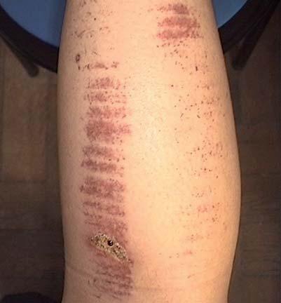 Uszkodzenie skóry wywołane zabiegiem depilacji przy użyciu IPL (tydzień po zabiegu).