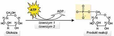 2.4.3. Reakcje fosforylacji glukozy do glukozo-6-fosforanu katalizują heksokinaza lub glukokinaza. Heksokinaza (izoenzymu 1) obecna jest we wszystkich komórkach tkanek obowodowych (pozawątrobowych) i ma bardzo wysokie powinowactwo do glukozy (KM = 0,01 mmol/l), dzięki czemu jest aktywna w obecności niskich stężeń glukozy. Natomiast w komórkach wątroby obecna jest glukokinaza (izoenzym 2), który „działa” przy wysokich stężeniach glukozy (pojawiających się podczas trawienia węglowodanów), ponieważ ma znacznie mniejsze powinowactwo do glukozy (KM = 20 mmol/l). Glukokinaza fosforyluje glukozę, podczas gdy heksokinaza fosforyluje także inne heksozy (fruktoza, galaktoza) i aktywność heksokinazy jest hamowana przez glukozo-6-fosforan.