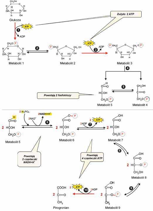 2.5.3. Metabolity powstające w tym procesie to: glukozo-6-fosforan (1), fruktozo-6-fosforan (2), fruktozo-1,6-difosforan (3), 3-fosfodioksyaceton (4), 3-fosfogliceroaldehyd (5), 1,3-difosfoglicerynian (6), 3-fosfoglicerynian (7), 2-fosfoglicerynian (8), fosfoenolopirogronian (9).