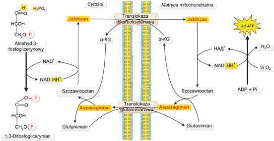 2.6.2. Mechanizm wahadłowy przedstawiony na rycinie 2.6a jest mechanizmem transportu wahadłowego jabłczanu i asparaginianu, realizowanym w komórkach mięśnia sercowego, wątroby i nerek. Przy wysokim stężeniu NADH+H+ (utworzonego w reakcji 6 przedstawionej na rycinie 2.5) cytoplazmatyczna dehydrogenaza jabłczanowa (zależna od NAD+) przywraca jabłczan, wykorzystując nadmiar NADH+H+ (tzn. ze szczawiooctanu w obecności NADH+H+ powstaje jabłczan i NAD+). Następnie, dzięki translokazie dikarboksylowej, jabłczan przechodzi przez błonę do macierzy mitochondrialnej, gdzie jest utleniany przez mitochondrialną dehydrogenazę jabłczanową zależną od NAD+ i w efekcie powstaje NADH+H+ oraz szczawiooctan. Dzięki temu mechanizmowi protony zawarte w cytoplazmatycznym NADH+H+ zostają przeniesione na mitochondrialny NAD+, a więc w mitochondriach powstaje NADH+H+. W ten sposób powstały w cytoplazmie NADH+H+ może być wykorzystany w mitochondriach w procesie fosforylacji oksydacyjnej.