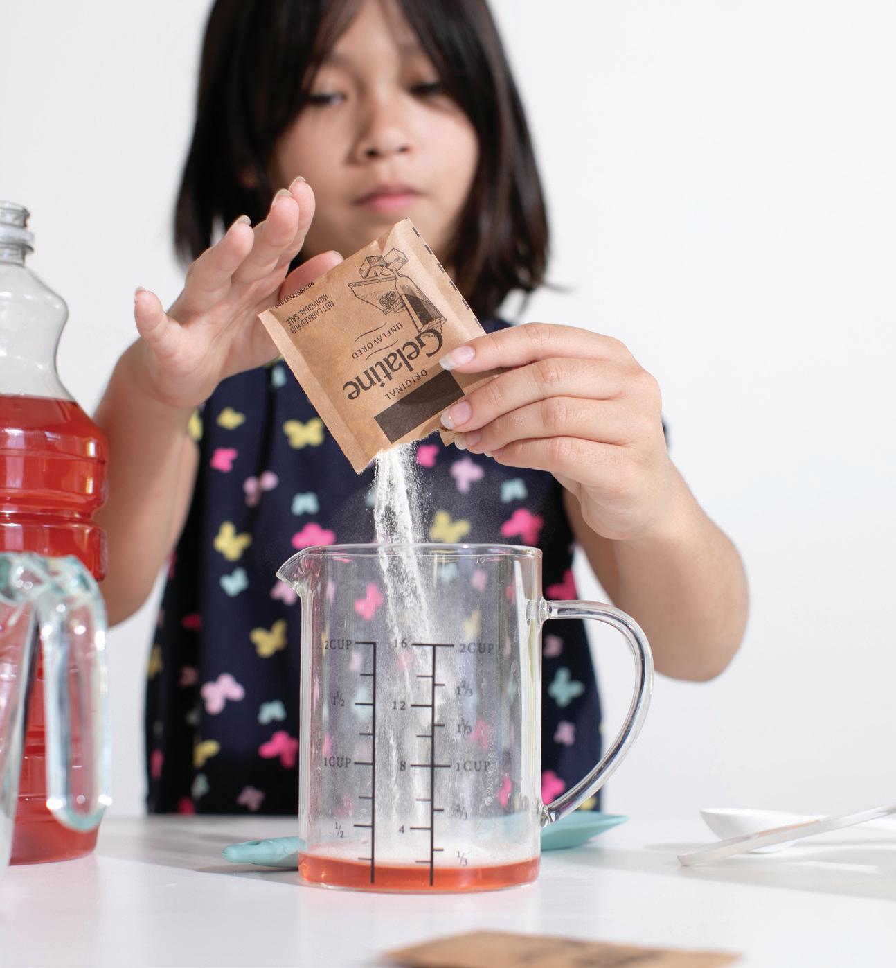 2. Wsyp zawartość 1 torebki żelatyny w proszku do soku i mieszaj przez 20 sekund.