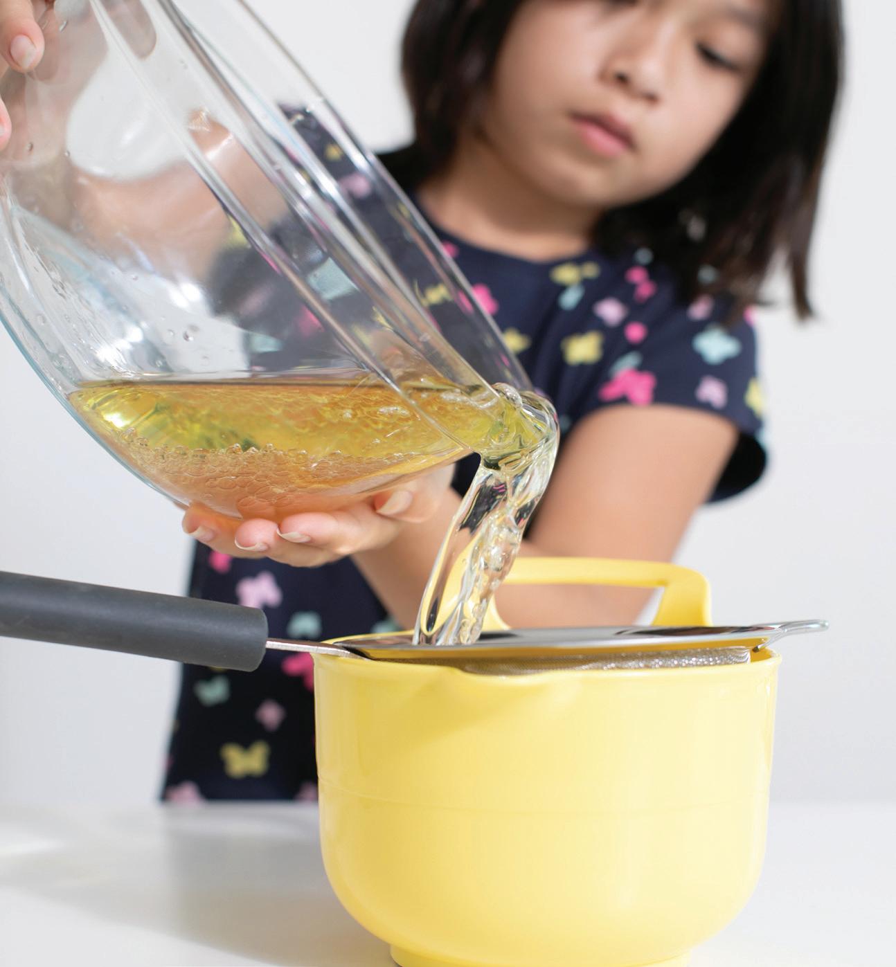 10. Przelewaj mieszaninę z granulkami przez durszlak do pojemnika na resztę oleju.