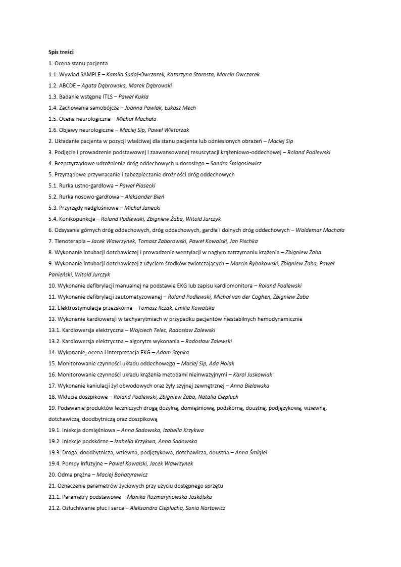 Piśmiennictwo 1. Huis In ‘t Veld M.A., Allison M.G., Bostick D.S. i wsp. Ultrasound use during cardiopulmonary resuscitation is associated with delays in chest compressions. Resuscitation. 2017; 119: 95–98. 2. Kerber R.E., Kienzle M.G., Olshansky B. i wsp. Ventricular tachycardia rate and morphology determine energy and current requirements for transthoracic cardioversion. Circulation. 1992; 85: 158–163. 3. Kerber R.E., Martins J.B., Kienzle M.G. i wsp. Energy, current, and success in defibrillation and cardioversion: clinical studies using an automated impedance-based method of energy adjustment. Circulation. 1988; 77: 1038–1046. 4. Schmidt A.S., Lauridsen K.G., Torp P. i wsp. Maximum-fixed energy shocks for cardioverting atrial fibrillation. Eur Heart J. 2020; 41: 626–631. 5. Soar J., Nolan J.P., Bottiger B.W. i wsp. European Resuscitation Council Guidelines for Resuscitation 2015: Section 3. Adult advanced life support. Resuscitation. 2015; 95: 100–147. 6. Zalewski R., Puślecki M., Szarpak Ł. i wsp. Impact of Application of Multifunction Electrode (MFE) Pads on Cardiopulmonary Resuscitation Quality. Emerg Med Int. 2020; 2020: 2675214.