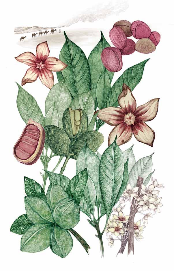 Kola pochodzi z wilgotnej tropikalnej Afryki Zachodniej. Dwa podobne gatunki: C. acuminata, o spiczastych liściach, i C. nitida, o lśniących liściach, to średniej wielkości rośliny zimozielone, zwykle o wysokości poniżej 15 metrów i prostym, przysadzistym pniu. Jej jaskrawe, bladokremowe kwiaty to pięcioramienne gwiazdy, z których każda ma bordową obwódkę w środku. Owoce wyglądają mało obiecująco – guzowate zielone mieszki przypominające strąki o długości 15 centymetrów, które brązowieją i pękają, odsłaniając garść gładkich, czerwonych lub białych nasion wielkości kasztana. Ale te nasiona koli mają moc: zawierają dwa razy więcej kofeiny (naturalnego środka owadobójczego) niż kawa, wraz z garścią innych stymulantów i maleńką szczyptą strychniny. Są one żute nieustannie i zwyczajowo w całym regionie, a ich początkowy gorzki smak ustępuje miejsca słodyczy i podobno nadaje światu różowy blask.