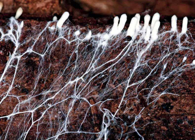 Wyobraźmy sobie kłodę, która była kiedyś pniem drzewa. Drzewo to obumarło ze starości lub padło ofiarą choroby wywołanej inwazją jakichś patogenów. Gdy tylko się przewróciło, grzyby natychmiast zaczęły rozprzestrzeniać się w jego biomasie i ją rozkładać. Były one oczywiście częścią ogromnej sieci podziemnej wegetacji zwanej grzybnią, złożonej z drobnych żywych nici przypominających nici pajęcze, zwanych strzępkami. Wzdłuż tysięcy kilometrów tych struktur oplatających jedną kłodę próchniejącego drzewa grzybnia wydziela enzymy i kwasy organiczne rozkładające ligninę zawartą w ścianach komórkowych drewna, nadającą mu budowę wewnętrzną i wytrzymałość mechaniczną.
