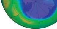Stężenie ozonu nad Antarktydą, obrazujące spadek stężenia ozonu, nazwany dziurą ozonową. Zdjęcie to wykonano 15 września 2015. Rozmiar dziury ozonowej zmienia się co roku, zależnie od warunków pogodowych. Naukowcy przewidują, że dziura ozonowa zaniknie całkowicie nie wcześniej niż około roku 2050, z powodu długiego czasu „życia” CFC, które zostały wyemitowane, zanim zostały zakazane. Stężenie ozonu mierzone jest w jednostkach Dobsona (DU). Wyobraźmy sobie, że cały ozon w pionowej kolumnie zostałby sprężony do standardowego ciśnienia i temperatury, tworząc płaską warstwę. 1 Jednostka Dobsona odpowiada grubości warstwy 0,01 mm. Źródło ilustracji: Goddard Space Flight Centre NASA