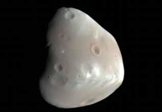 Kolorowe zdjęcie Fobosa, większego z dwóch księżyców Marsa, wykonane przez sondę Mars Express z odległości mniejszej niż 200 km. Poza kraterami uderzeniowymi widoczne są także regularne, równoległe bruzdy na powierzchni. Pokrywają niemal cały księżyc, przecinając przy tym przeważającą część większych kraterów. Nie wiadomo jeszcze jednoznacznie, czy są to rysy powstałe wskutek uderzeń odłamków skalnych, czy też ślady silnych oddziaływań pływowych między Marsem a Fobosem mogące wywołać naprężenia wewnątrz księżyca
