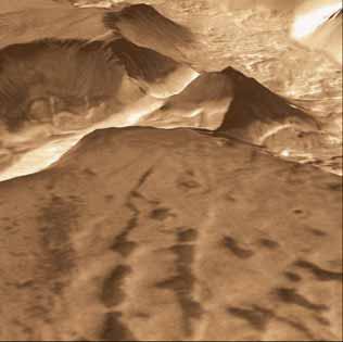 Również wiatr pozostawił swoje ślady niemal wszędzie na Marsie. Niezliczone, opływowe wały skalne, tak zwane jardangi, zostały wydrążone niczym strumieniem piasku z piaskarki z otaczających je mniej odpornych skał.