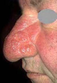 z objawów klinicznych – zaczerwienienie skóry (rumień), rozszerzone naczynia krwionośne, krosty, grudki i ewentualnie przerost skóry w postaci guzów,