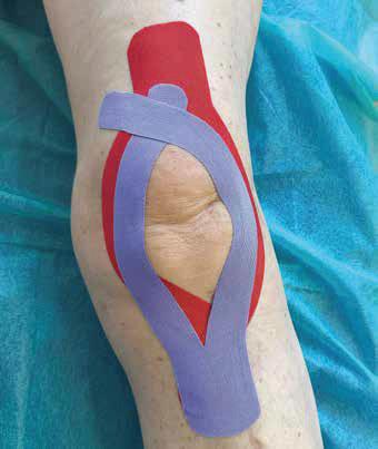 rozluźnianie bocznej grupy mięśni uda, na przykład poprzez techniki powięziowe, masaż głęboki albo rolowanie; elektrostymulację głowy przyśrodkowej mięśnia czworogłowego uda; aplikację kinesiotapingu odciążającą staw rzepkowo-udowy i korygującą ustawienie rzepki w bruździe międzykłykciowej kości udowej (ryc. 4.21);