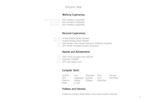 Hobbies and Interests Architecture, Drawing, Model Making, Movie Making, Sports, Gearhead 5