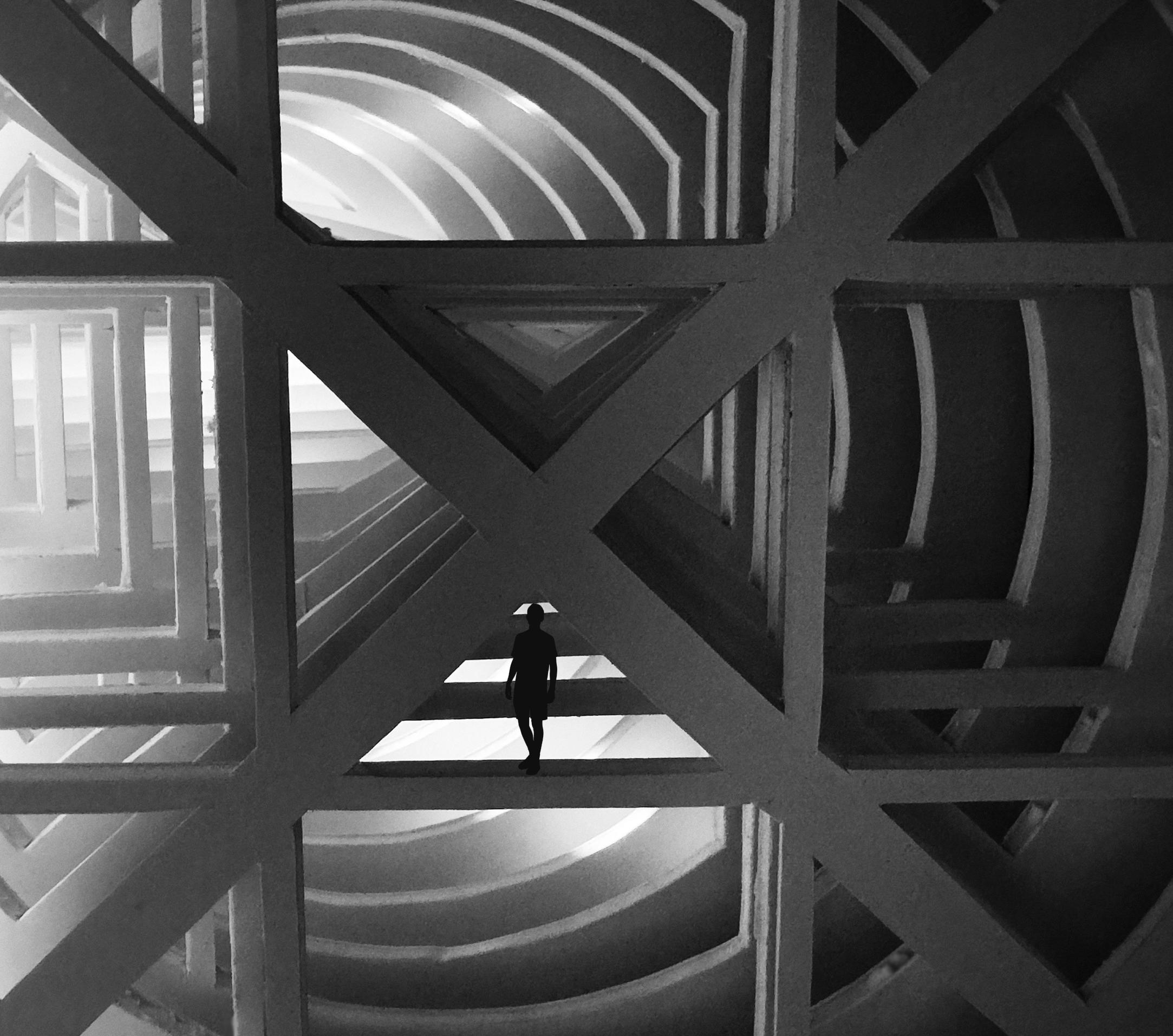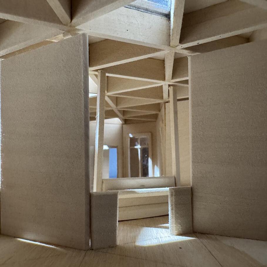 model was designed using 22 total pieces, consisting of 12 panels cut from foamcore, 11 supporting pieces keeping the model alighned, and a base for extra support. Once all of the pieces are assembled, they create a viewing experience guided by the path of shadows going through the structure.