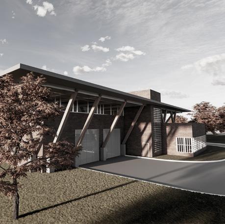 by the families of loved ones who are buried there. The design of this building is geometric and hexagonal to connect its users to nature. The overall structure is guided by the idea of a hexagonal grid that can be seen in the room layout as well as the frame under the roof.