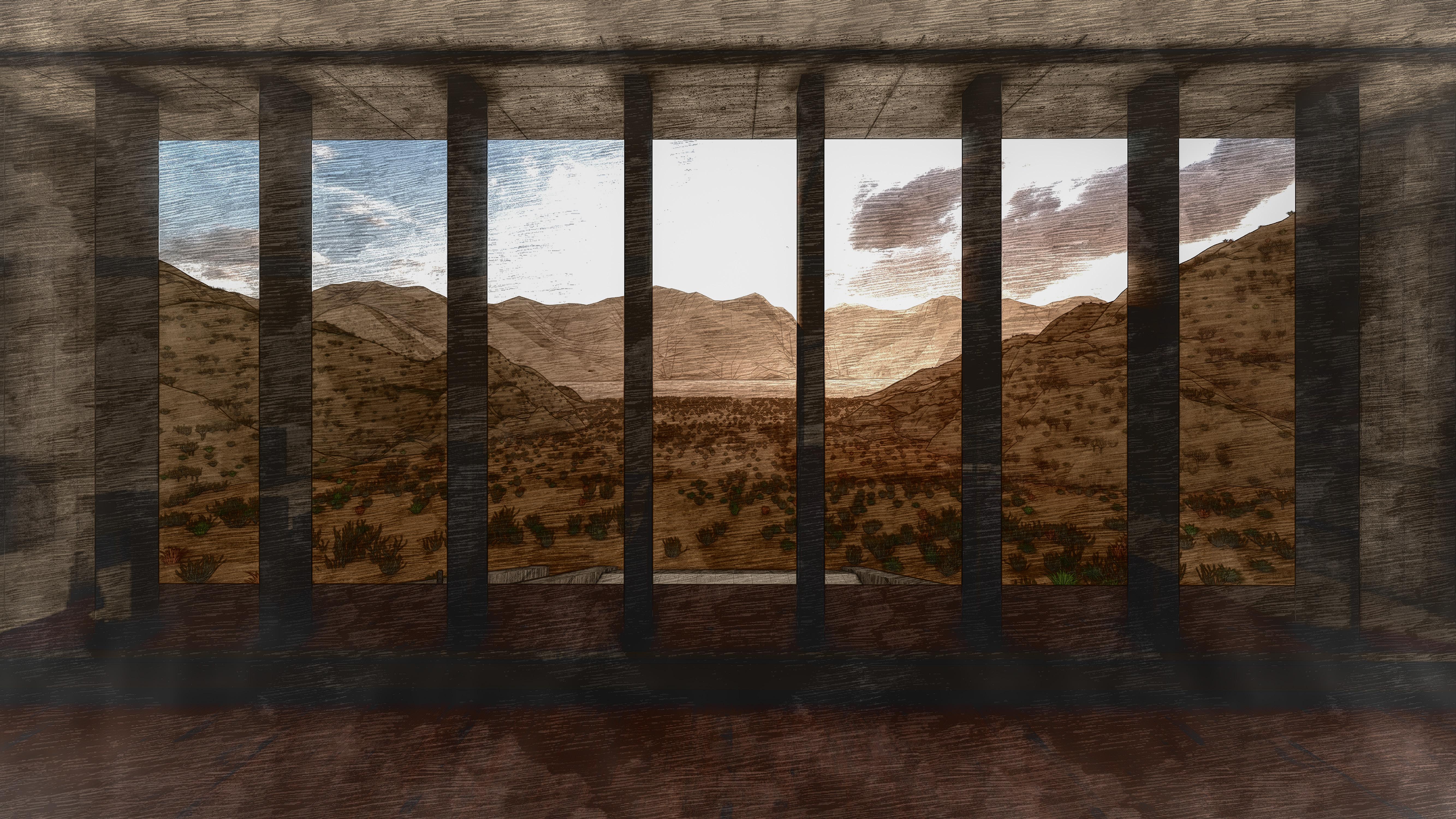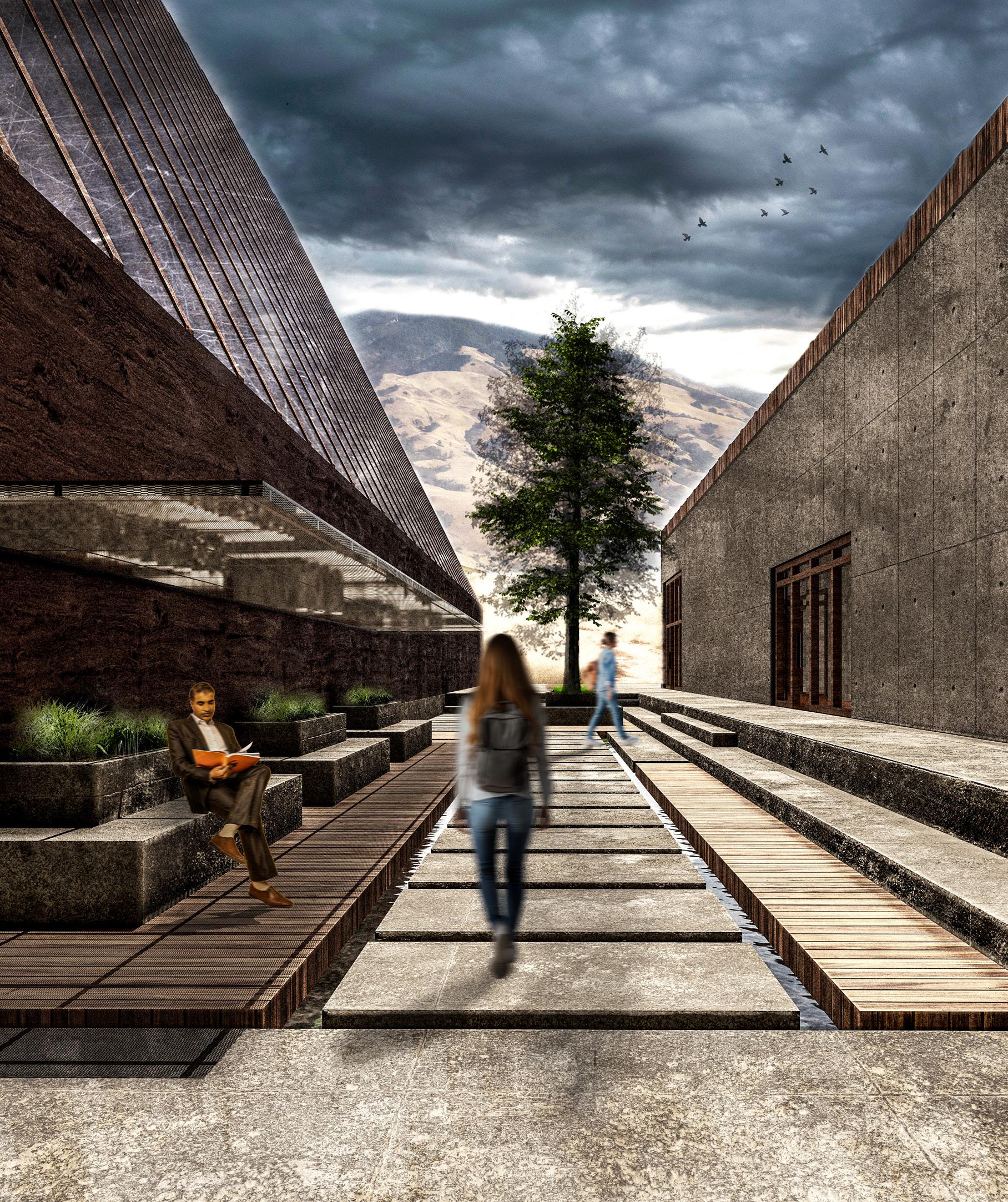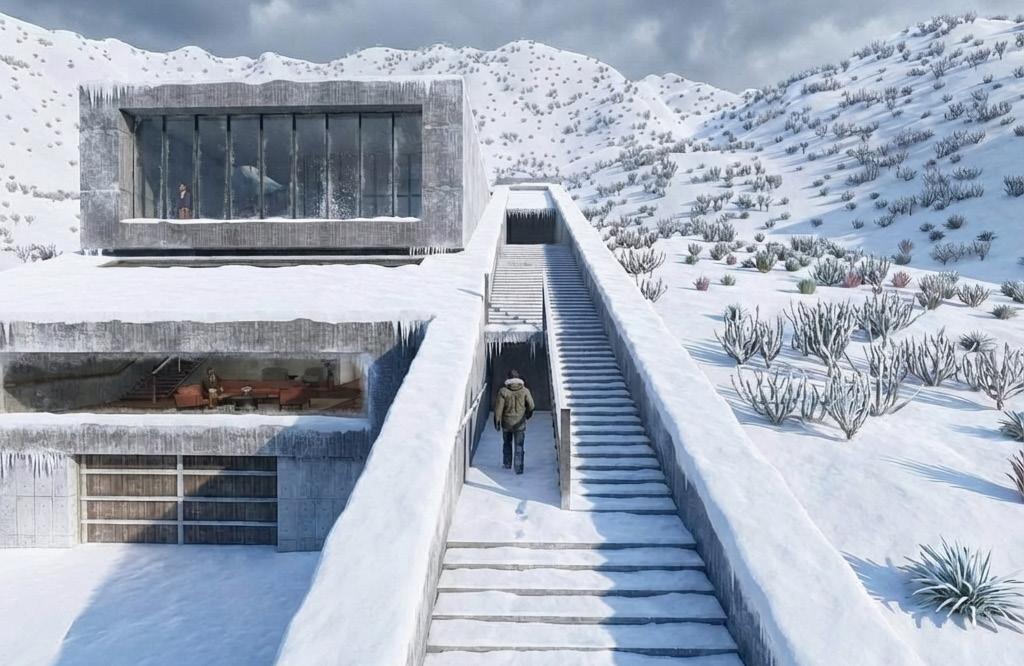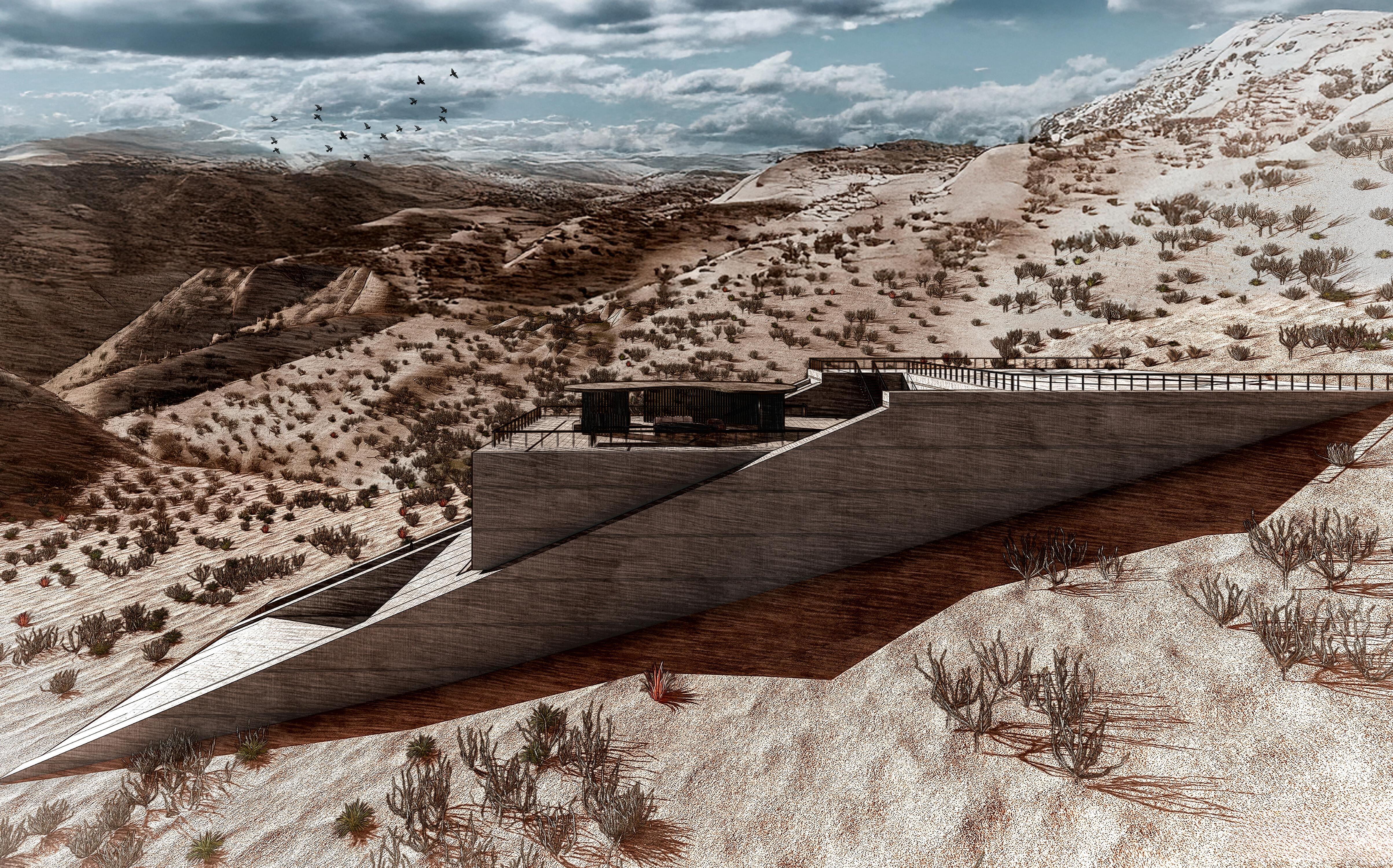 A concrete landscape observatory embedded into the slope at Pyramid Lake, designed to frame long panoramic viewsheds for climate researchers. It supports fieldwork with exterior circulation, large glazing, and a helipad.