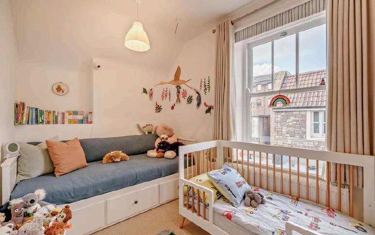 Upstairs continues the sense of space and light, with vaulted ceilings and twin Velux windows illuminating the landing. The generous primary bedroom includes a stylish en-suite shower room, while the second double bedroom offers a large builtin wardrobe, desk, and a sash window with views over the quiet mews. A third bedroom - currently used as a nursery/study - overlooks the courtyard below.