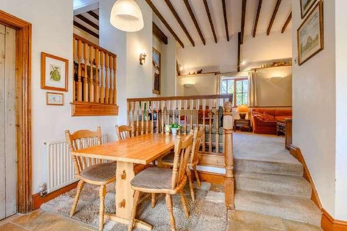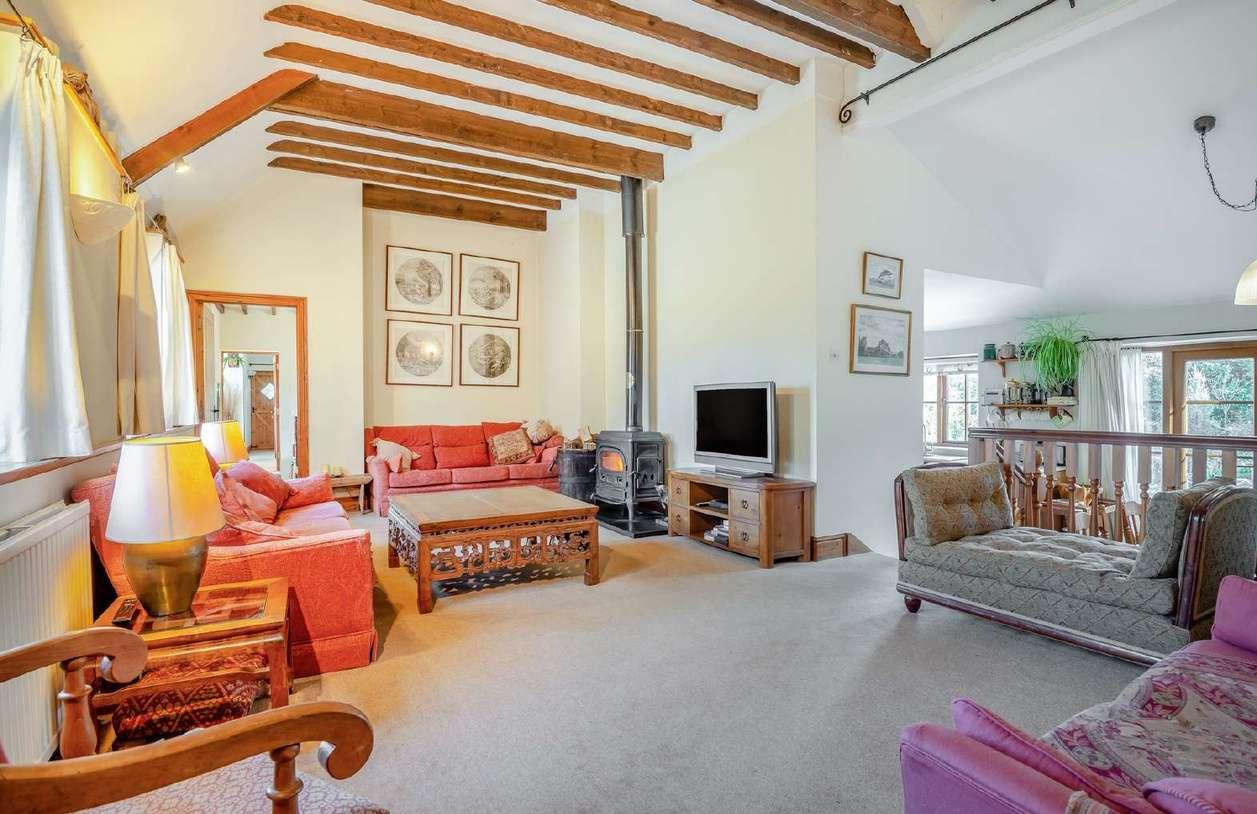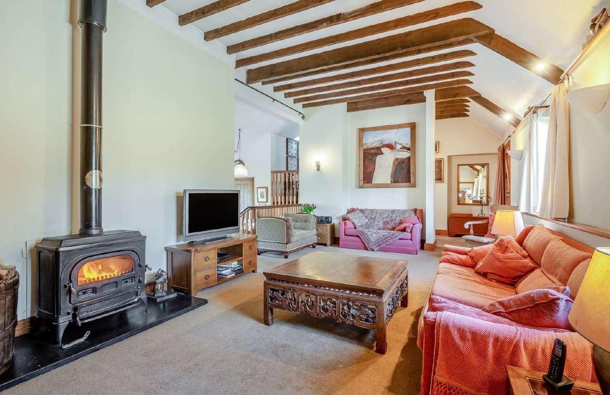 Tall impressive ceilings with exposed wooden beams, deep wooden window sills and an grand log burning stove all feature within the main sitting area, while a short staircase leads down to the semi-open plan kitchen and breakfast area.
