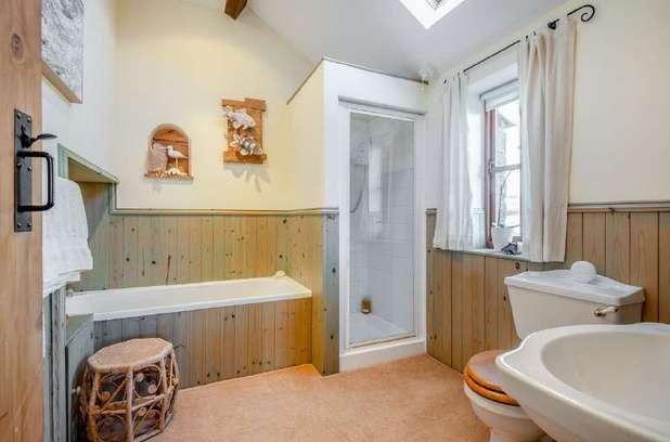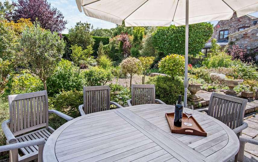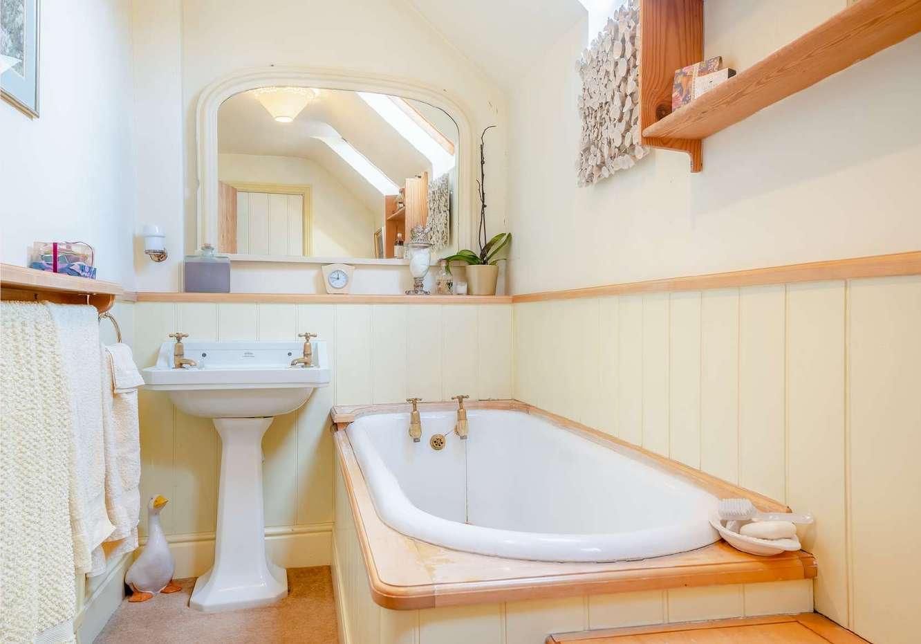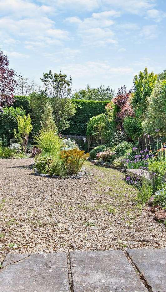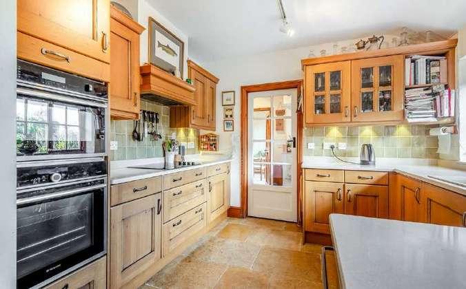 The kitchen with wooden cupboards, stone worktops and Cotswold stone floor sits snug around a corner and also benefits from a separate utility room and large pantry. Both kitchen and breakfast area overlook a pretty walled garden, to the rear of the property. This can be accessed from wooden French doors, perfect for an alfresco breakfast or morning coffee.